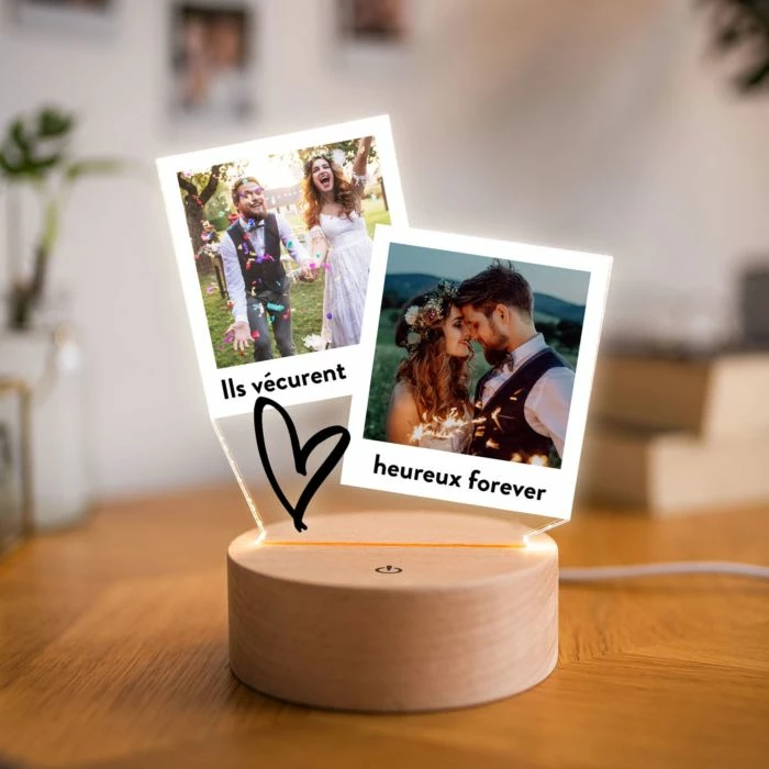 Il est normal que « belle idée de déco » rime avec « idée de cadeau romantique ». C’est le cas par exemple avec notre lampe LED personnalisée design Polaroid, sur laquelle on peut intégrer deux photos dans un cadre virtuel rétro et inscrire un petit mot. Idéal pour la Saint-Valentin, les anniversaires, les anniversaires de mariage ou tout autre jour qui célèbre les couples.
